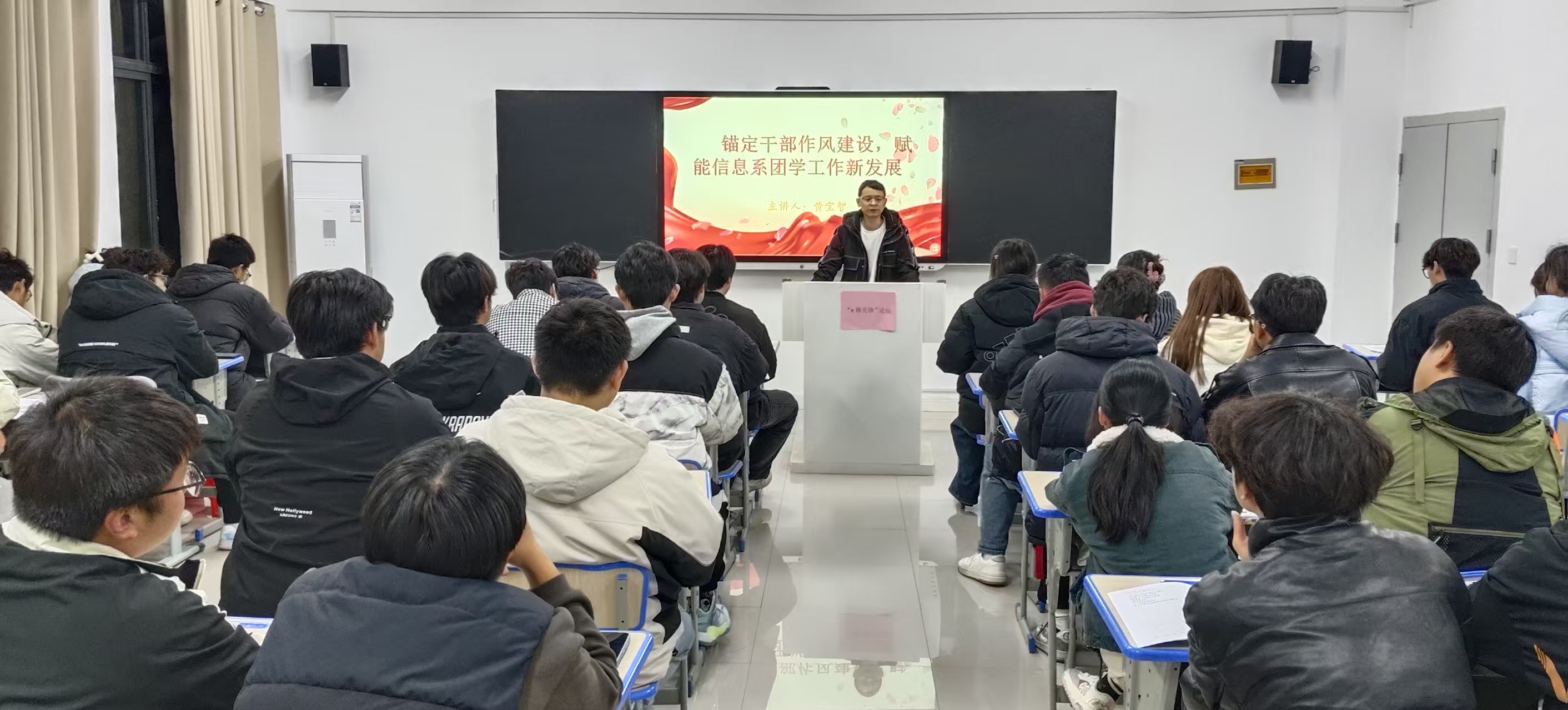 为加强学生干部队伍建设,提升班级管理效能与学生干部综合素质。11月19日晚,在尚信楼201教室,电子信息与传媒系依托“一站式”学生社区,成功举办“e路先锋”论坛之“锚定干部作风建设,赋能信息系团学工作新发展”专题讲座。参与本次讲座的有24级、25级全体班长及主要学生干部,讲座由系党务学工科科长黄宝智主讲。