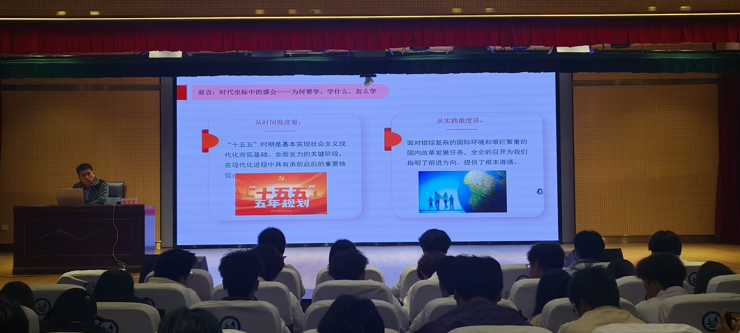讲座上,徐文文老师为同学们详细解读了二十届四中全会的时代背景与历史意义,深入剖析了“十四五”规划收官与“十五五”规划开启这一重要历史节点的时代特征。并通过C919大飞机商业首飞、嫦娥探月工程等典型案例,生动展示了我国在科技创新和重大工程建设领域取得的突破性成就,阐释了科技自立自强的深刻内涵。