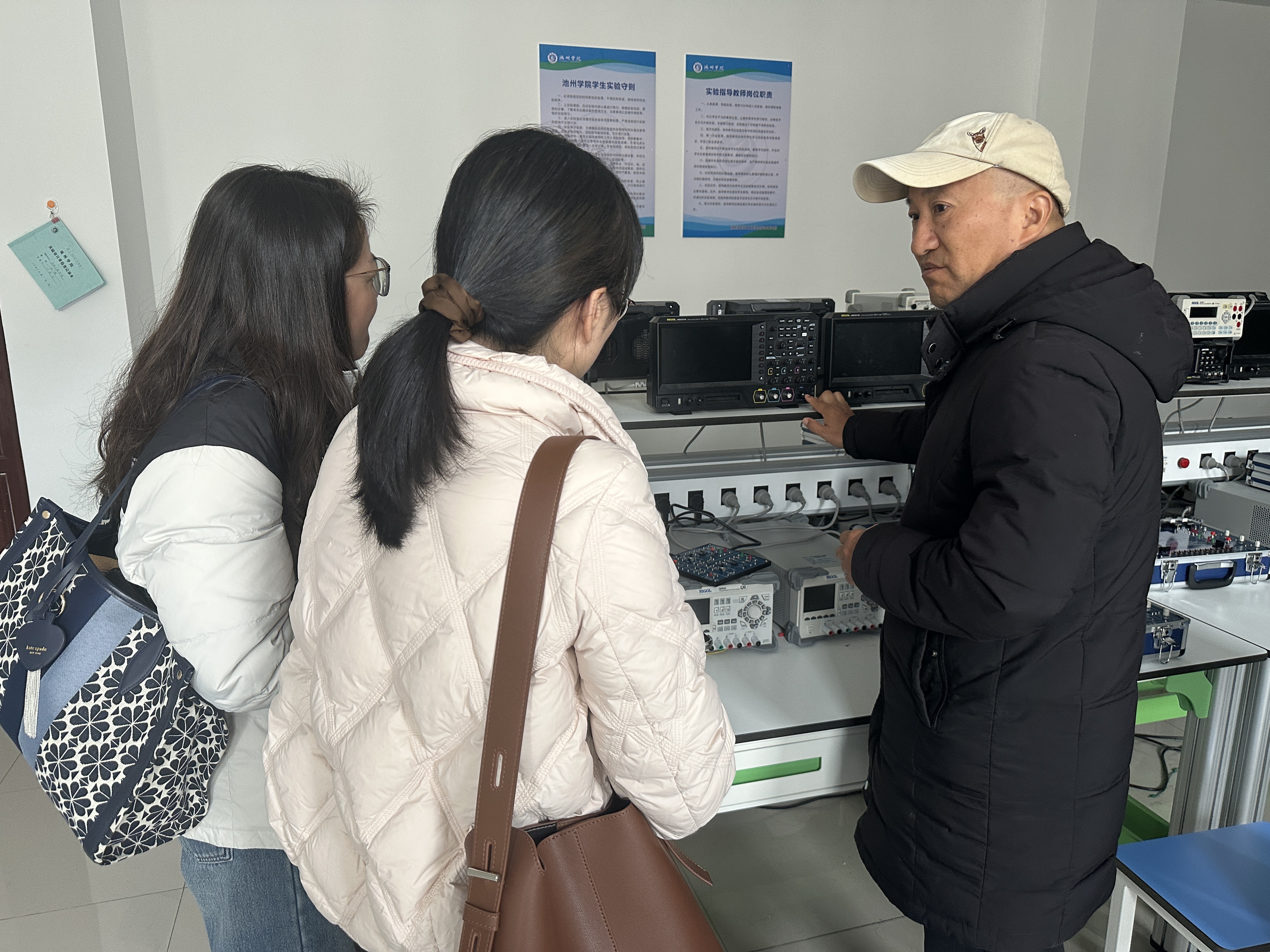 座谈会后,在钱叶旺教授的带领下,参观了池州学院电子技术实验室、IC仿真与设计实验室、电子工程实训中心等,钱教授介绍了实验室功能布局、设备配置及管理模式,并就大学生电子设计大赛、职业技能大赛备赛及电子技术实验室建设提出了具体建议。